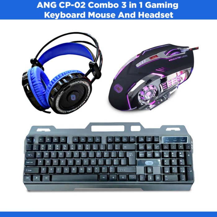 The ANG CP-02 3 in 1 Combo Gaming Keyboard, Mouse, Headphone is a gaming accessory package designed for PC gamers. The package includes a gaming keyboard, a gaming mouse, and a gaming headphone. Here are the key specifications: